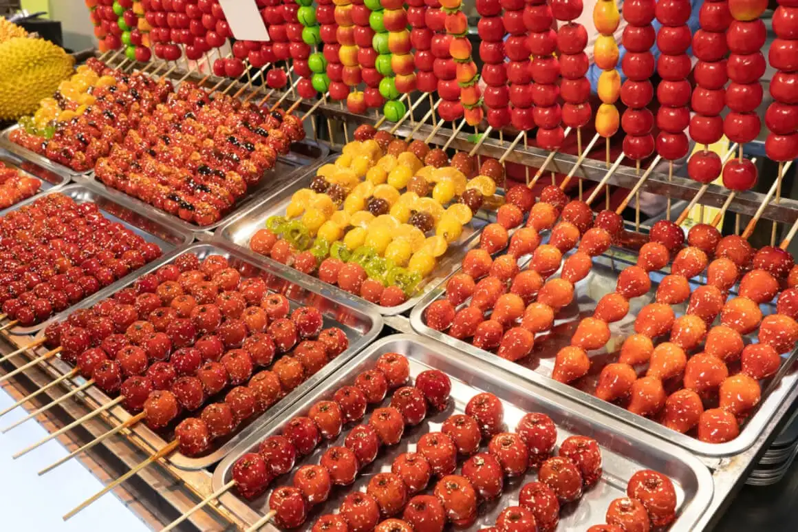 Ils sont vendus sur de longues et fines brochettes garnies d'aubépines sucrées et plutôt jolies ! Il n’est pas rare que d’autres fruits, comme les pommes et les fraises, soient confits et présentés de la même manière – mais les aubépines sont un favori national !