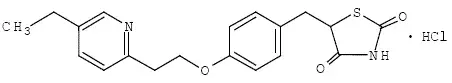 Pioglitazone [(±) -5 - [[4- [2- (5-éthyl-2-pyridinyl) éthoxy] phényl] méthyl] -24-] thiazolidinedione monohydrochloride contient un carbone asymétrique et le composé est synthétisé et utilisé comme mélange racémique. Les deux énantiomères de l'interconvert de pioglitazone en vain . Aucune différence n'a été trouvée dans l'activité pharmacologique entre les deux énantiomères. La formule structurelle est comme indiqué:
