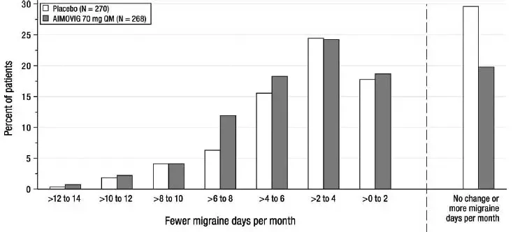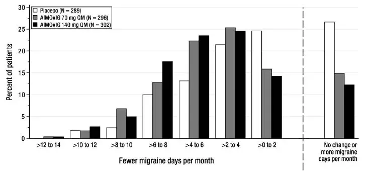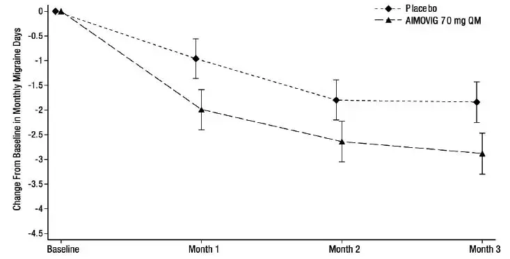 Dans les études cliniques contrôlées par placebo (études 1 2 et 3) sur 2184 patients 787 patients ont reçu au moins une dose d'Aimovig 70 mg une fois que 507 patients ont reçu au moins une dose de 40 mg d'AIMOVIG une fois par mois et 890 patients ont reçu un placebo pendant 3 mois ou 6 mois de traitement à double coup [voir [voir Études cliniques ]. Environ 84% étaient des femmes à 91% étaient blanches et l'âge moyen était de 42 ans à l'entrée de l'étude.