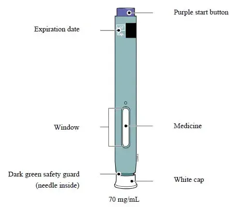 - Injection : 70 mg / ml dans un suréclick préfabillé à dose unique ® auto-injecteur