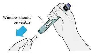 4A Saisissez l'auto-injecteur afin que vous puissiez voir la fenêtre. Tirez le capuchon blanc directement. Vous devrez peut-être tirer dur.