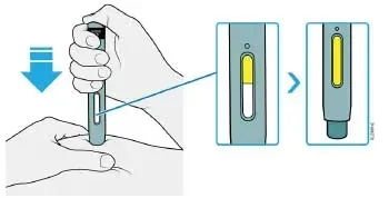 4E Continuez à pousser l'auto-injecteur vers le bas. Lorsque la fenêtre est entièrement jaune, l'injection est terminée.
