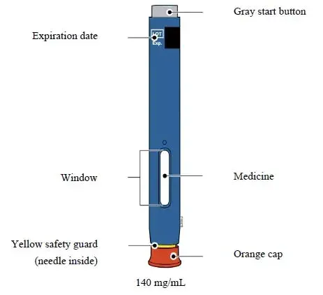 - Injection : 140 mg / ml dans un suréclick préfabriqué à dose unique ® auto-injecteur