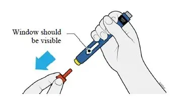 4A Saisissez l'auto-injecteur afin que vous puissiez voir la fenêtre. Tirez le capuchon orange directement. Vous devrez peut-être tirer dur.