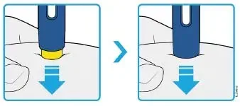 4C pousse fermement l'auto-injecteur vers le bas jusqu'à ce que le garde de sécurité jaune cesse de bouger. Maintenez l'auto-injecteur vers le bas, ne soulevez pas.