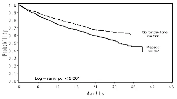 Le critère d'évaluation principal pour les RALES était le temps de la mortalité toutes causes. Les RALES ont été interrompus tôt en raison des bénéfices de mortalité significatifs démontrés lors d'une analyse intermédiaire prévue. Par rapport à la spironolactone placebo a réduit le risque de décès de 30% (P <0.001; 95% confidence interval 18% to 40%). Spironolactone also reduced the risk of hospitalization for cardiac causes (defined as worsening heart failure angina ventricular arrhythmias or myocardial infarction) by 30% (p <0.001; 95% confidence interval 18% to 41%).