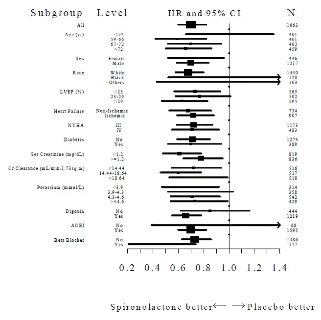 The Randomized Aldactone Evaluation Study (RALES) was a placebo controlled double-blind study of the effect of spironolactone on mortality in patients with highly symptomatic heart failure and reduced ejection fraction. To be eligible to participate patients had to have an ejection fraction of ≤ 35% NYHA class III-IV symptoms and a history of NYHA class IV symptoms within the last 6 months before enrollment. Patients with a baseline serum creatinine of > 2.5 mg/dL or a recent increase of 25% or with a baseline serum potassium of > 5.0 mEq/L were excluded.