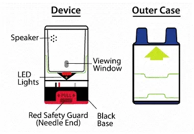 AUVI-Q comprend des indices audibles (Instructions de voix électronique bips) et des indices visibles (lumières LED) à utiliser. L'aiguille se rétracte automatiquement une fois l'injection terminée.