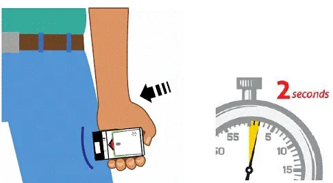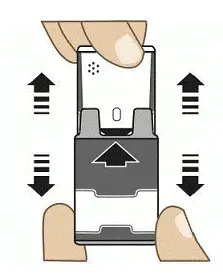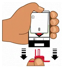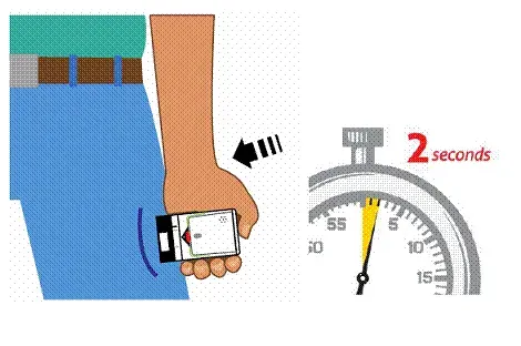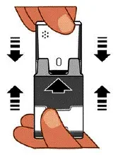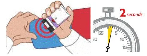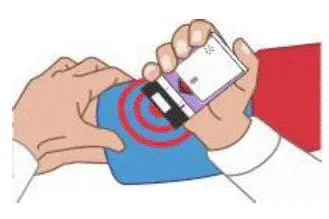 Note: AUVI-Q fait un son distinct (cliquez et sifflement) lorsque vous le poussez contre votre cuisse extérieure. Ceci est normal et indique que AUVI-Q fonctionne correctement. Ne retirez pas Auvi-Q de votre jambe lorsque vous entendez le clic et le sifflement.