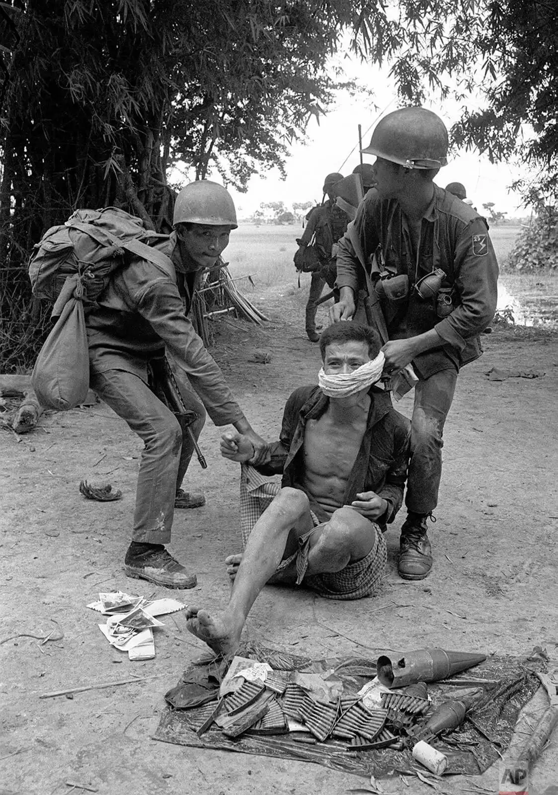 Des soldats vietnamiens retiennent un Khmer rouge présumé vers 1971.