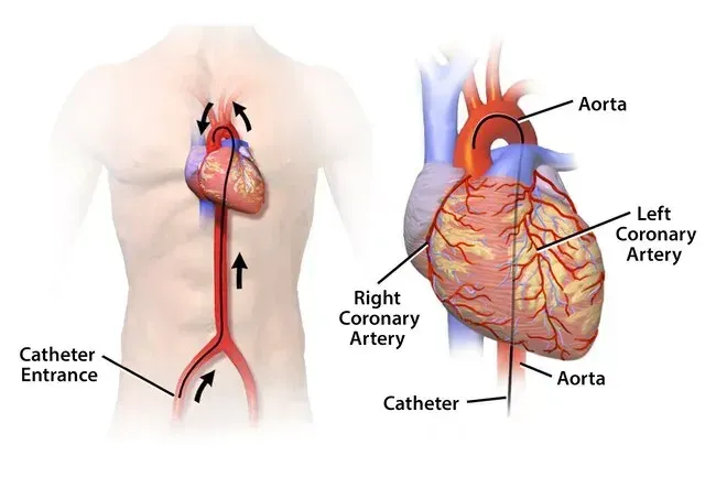Votre médecin peut mettre un tube mince doux appelé cathéter dans un vaisseau sanguin dans votre bras de cou ou le haut de la cuisse et le guider vers votre cœur. Elle peut envoyer un colorant spécial visible sur les rayons X dans le tube pour vérifier les artères rétrécies ou bloquées. Elle peut également tester la réponse de votre cœur à certains médicaments ou signaux électriques. Elle peut même utiliser le tube pour effectuer l'angioplastie une procédure pour ouvrir les artères bloquées.