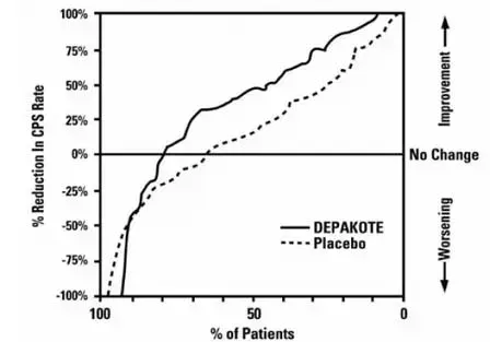 La figure 2 présente la proportion de patients (axe x) dont la réduction en pourcentage de la ligne de base dans les taux de crise partielle complexe était au moins aussi grande que celle indiquée sur l'axe Y dans l'étude de thérapie complémentaire. Une réduction positive en pourcentage indique une amélioration (c'est-à-dire une diminution de la fréquence des crises) tandis qu'une réduction de pourcentage négative indique une aggravation. Ainsi, dans une affichage de ce type, la courbe pour un traitement efficace est décalée à gauche de la courbe pour le placebo. Ce chiffre montre que la proportion de patients atteignant un niveau d'amélioration particulier était systématiquement plus élevé pour le valproate que pour le placebo. Par exemple, 45% des patients traités par du valproate avaient une réduction ≥ 50% du taux de crise partiel complexe contre 23% des patients traités par placebo.
