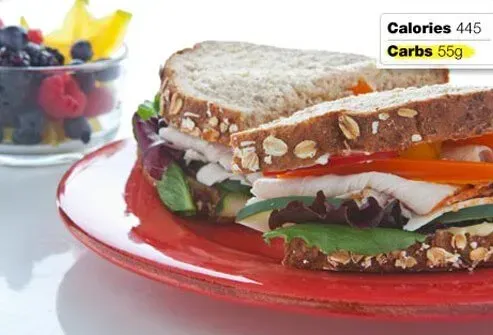 Commandez un sandwich à la dinde sur du pain frais à grain entier empilé avec des légumes. Faites-en un combo avec une salade de fruits et un verre de lait faible en gras pour un excellent repas adapté au diabète. Six grammes de fibres aident à gérer la glycémie. Les fruits de lait et les légumes sont tous riches en potassium pour aider à abaisser la pression artérielle.