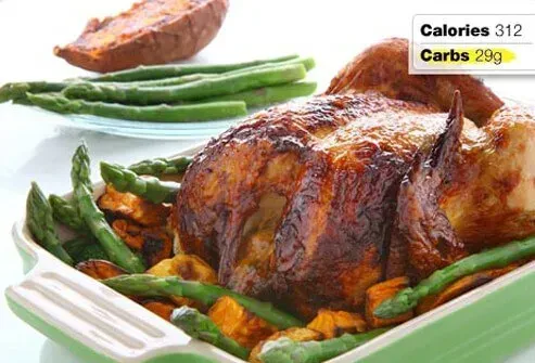 Le poulet rôti est simple à faire. Servir 1/2 tasse de peau de viande de sein enlevée. Ajouter les patates douces et les asperges pour un repas super nutritif. Les pommes de terre sont riches en fibres et en vitamine A. Ils sont si naturellement sucrés, tout ce dont ils ont besoin, c'est une pincée de cannelle une épice qui peut aider à gérer la glycémie.