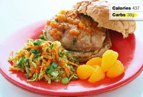 Faites ce burger de thon asiatique à la maison. Le thon vous donne des acides gras oméga-3 en santé cardiaque. Ajouter un chignon à grains entiers 1/2 tasse de salade de salade de carrot au brocoli et quelques tranches d'orange. Évitez le chignon pour raser 23 grammes de glucides de votre assiette. Les hamburgers de dinde et de légumes peuvent également être de bonnes alternatives si vous vérifiez le nombre de calories.