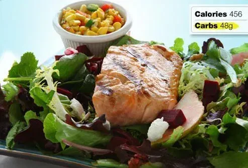 Un super repas pour les personnes atteintes de diabète ou quiconque commence par du poisson grillé ou cuit au four. Une salsa de maïs grillée et une salade de poire de betterave et de noix complètent le repas. Le total des glucides ne va pas trop loin (48 grammes) et il y a un bon équilibre entre les autres nutriments clés: la fibre protéique et la graisse.