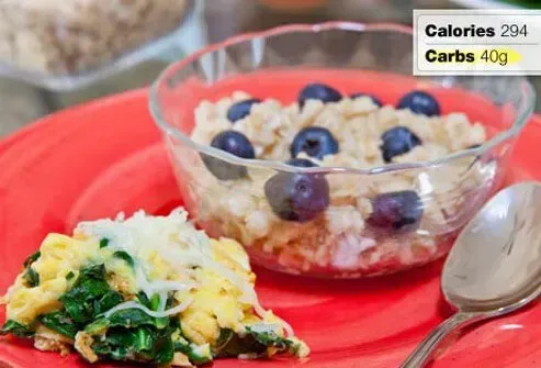 Ce repas rapide offre des protéines dans un œuf brouillé et seulement 40 glucides principalement à partir de flocons d'avoine riches en fibres et de bleuets. La fibre ralentit la digestion pour prévenir les pointes de glycémie. Les personnes atteintes de diabète doivent regarder tous les types de glucides: les pâtes à pain de céréales pâtes féculentes légumes sucrés lait de fruits et yaourt. Écartez votre total de glucides tout au long de la journée.