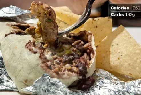 Avant une bouchée de burrito, vous pouvez obtenir 98 grammes de glucides et 810 calories dans un panier de croustilles et de salsa. Si vous essayez de s'arrêter et de manger moins de sodium comme beaucoup de personnes atteintes de diabète, le burrito ajoute 950 calories. Vous obtenez également bien plus qu'une journée entière de sodium.