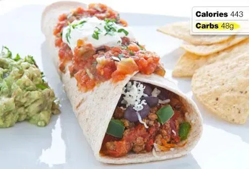 Le bœuf maigre et les haricots noirs font de ce plat mexicain une bonne option pour un régime diabétique. La fibre des haricots peut aider à abaisser le cholestérol sanguin et à contrôler la glycémie. Allez lourd sur les légumes et léger sur le fromage. Profitez de 10 petits croustilles de maïs (1 once) avec un peu de guacamole.