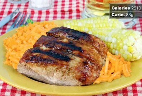 Ce repas du sud classique charge trop d'aliments de folie sur une seule assiette. Les côtes de porc gras coulent dans une sauce barbecue sucrée et flanquée de macaroni et de fromage et de maïs en épi. Le maïs est un légume à glucides avec environ 19 grammes de glucides dans une oreille moyenne. C'est juste trop tout autour.