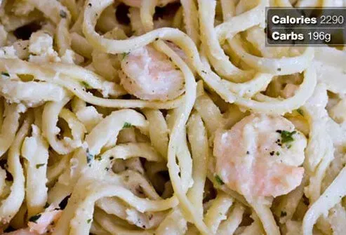 Les pâtes aux crevettes typiques Alfredo dans votre restaurant local peuvent avoir d'énormes portions et 73 grammes de graisses saturées qui obstruaient l'artère. Le diabète rend les maladies cardiaques plus probables, les médecins conseillent donc à la limitation des graisses saturées à environ 15 grammes par jour pour un régime de 2000 calories.