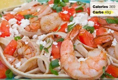 Les crevettes faibles en gras et les tomates mûres juteuses font de ce plat de pâtes pour tout le monde. Le fromage feta a une saveur acidulée avec un tiers moins de matières grasses que le fromage dur. Essayez des pâtes qui sont faites de 50% à 100% de grains entiers pour ajouter les avantages de la fibre: un meilleur contrôle de la glycémie et plus de satisfaction.