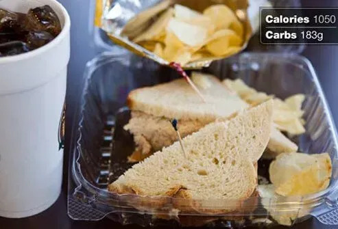 Le déjeuner est tout aussi important que les autres repas lorsque vous souffrez de diabète, alors ne prenez pas n'importe quel sandwich ou enveloppement. La salade de thon prêt-à-manger peut nager dans la mayonnaise. Les frites et une grande boisson sucrée poussent le total des glucides à 183 grammes: beaucoup trop.