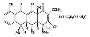 avec une formule moléculaire de c 22 H 24 N 2 O 8 HCl ½ C 2 H 6 O ½ h 2 O et un poids moléculaire de 512,9. Le nom chimique de l'hyclate de doxycycline est [4S (4AR5S5AR6R12AS)] - 4- (diméthylamino) -144a55a61112a-octahydro-35101212a-pentahydroxy-6-méthyl-11dixonylenthyle (1) alcools de l'éthyle (1-carboxamide monohydrate. L'hyclate de doxycycline est une poudre cristalline jaune soluble dans l'eau et dans des solutions d'hydroxydes et de carbonates alcalins. La doxycycline a un degré élevé de solubilité lipidique et une faible affinité pour la liaison au calcium. Il est très stable dans le sérum humain normal. La doxycycline ne se dégradera pas en une forme épianhydro.