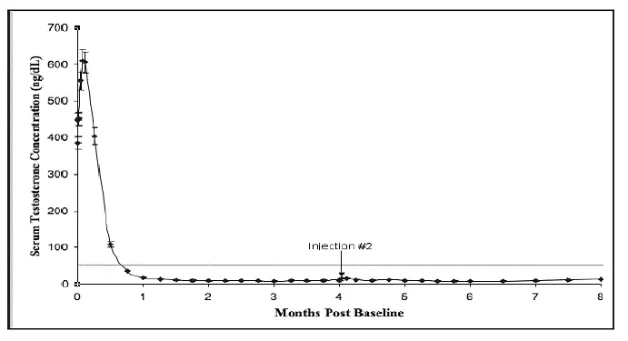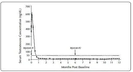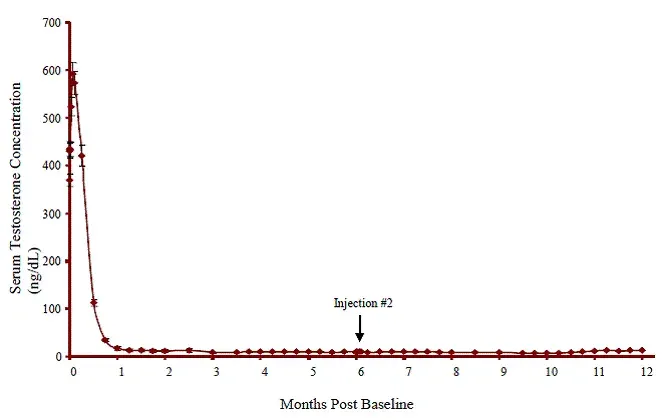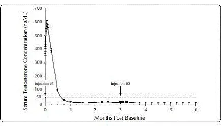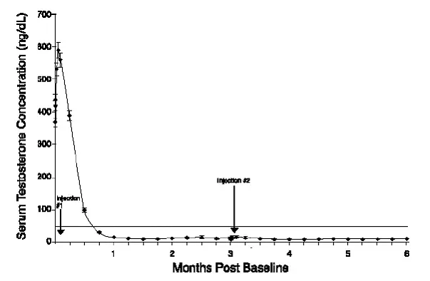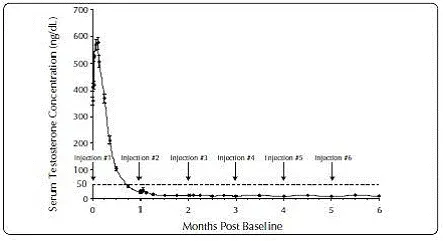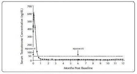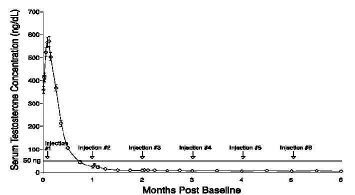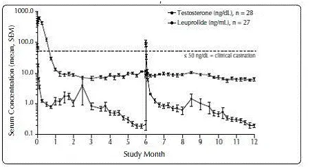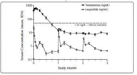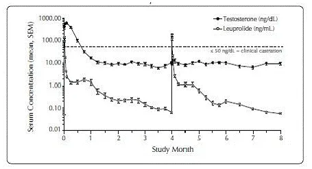 Pendant l'étude AGL0001 en utilisant Eligard ® 30 mg une fois la suppression de la testostérone inférieure à 50 ng / dL a été obtenue, trois patients (3%) ont démontré une percée. Chez le premier de ces patients, une seule concentration sérique de testostérone de 53 ng / dL a été signalée le lendemain de la deuxième injection. Dans cette suppression du patient inférieure à 50 ng / dL, a été signalé pour tous les autres moments. Chez le deuxième patient, une concentration sérique de testostérone de 66 ng / dL a été signalée immédiatement avant la deuxième injection. Cela a atteint une concentration maximale de 147 ng / dL le deuxième jour après la deuxième injection. Dans cette suppression du patient, en dessous de 50 ng / dL, a de nouveau été atteinte le septième jour après la deuxième injection et a été maintenue par la suite. Dans les concentrations de testostérone sérique finales finales,> 50 ng / dL ont été signalées à 2 et 8 heures après la deuxième injection. La concentration sérique de testostérone a atteint un maximum de 110 ng / dL le troisième jour après la deuxième injection. Dans cette suppression du patient, en dessous de 50 ng / dL, a de nouveau atteint dix-huit jours après la deuxième injection et a été maintenu jusqu'au dernier jour de l'étude lorsqu'une concentration sérique de testostérone sérique de 55 ng / dL a été signalée.