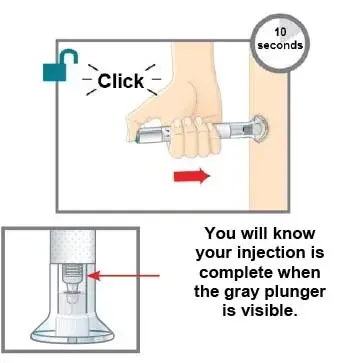 R. Après avoir appuyé sur le bouton d'injection de sarcelle, vous entendrez 2 clics bruyants. Le deuxième clic vous indique que votre injection est terminée. Vous verrez également le piston gris en haut de la base claire.
