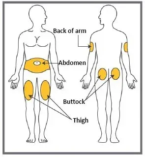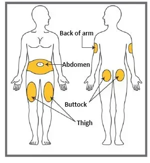 - Ne pas injecter au même endroit exactement. Par exemple, si votre première injection était dans votre abdomen, votre prochaine injection pourrait être dans une autre zone de votre abdomen.