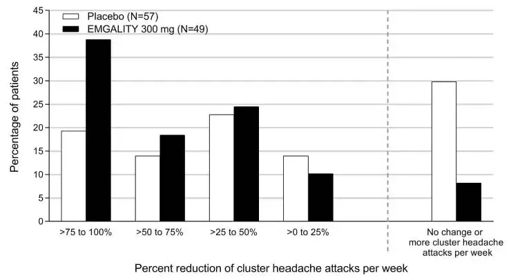 Émgalité was studied for up to 2 months in a placebo-controlled trial in patients with episodic cluster headache (Study 4) [see Études cliniques ]. Au total, 106 patients ont été étudiés (49 sur l'emgalité et 57 sur placebo). Parmi les patients traités à l'emgalité, environ 84% étaient des hommes, 88% étaient blancs et l'âge moyen était de 47 ans à l'entrée de l'étude. Deux patients traités à l'emgalité ont interrompu le traitement en double aveugle en raison d'événements indésirables.