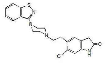 Geodon est disponible sous forme de capsules (chlorhydrate de ziprasidone) pour l'administration orale et comme injection (mésylate de ziprasidone) pour une utilisation intramusculaire uniquement. La ziprasidone est un agent psychotrope qui n'est chimiquement pas lié aux agents antipsychotiques de la phénothiazine ou de la butyrophénone. Il a un poids moléculaire de 412,94 (base libre) avec le nom chimique suivant: 5- [2- [4- (12-benzisothiazol-3-yl) -1-piperazinyl] éthyl] -6-chloro-13-dihydro-2h-indol-2-one. La formule empirique de c 21 H 21 CLN 4 OS (base libre de la ziprasidone) représente la formule structurelle suivante: