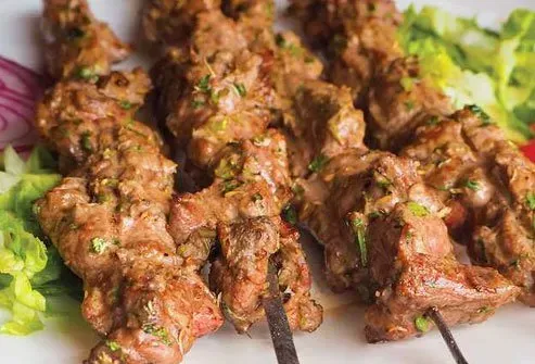 Ce n'est pas une sauce crémeuse qui amplifie le fat-o-mètre dans ce plat. C'est la viande. Selon l'agneau coupé peut avoir de 15 à 25 grammes de graisse dans une partie de 3 onces. C'est à peu près la taille d'un jeu de cartes. À la maison où vous pouvez choisir la coupe de viande, optez pour une jambe ou une longe et chargez-vous sur tous ces antioxydants comme la tomate et le curcuma au gingembre.