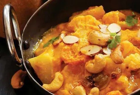 Navratan signifie «neuf joyaux» en hindi. C'est un nom ajusté pour un plat rempli de légumes noix et graines. Si vous le commandez dans un restaurant, il est souvent fini avec la moitié et la moitié pour lui donner une riche saveur crémeuse (et des calories et des graisses supplémentaires). Le yaourt de soja sous-nature ou le tofu mélangé à la maison pour lui donner un ajustement sain.