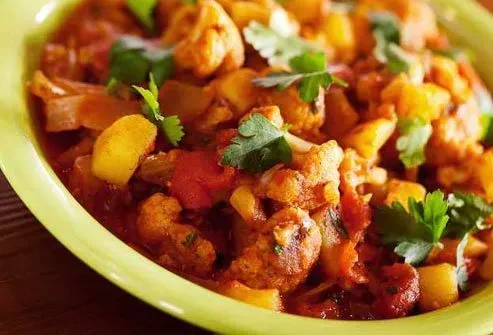 Ce n'est peut-être pas le plat le plus sexy du buffet indien. Vous pourriez passer juste devant vous sur votre chemin vers le poulet tikka masala et le riz basmati. Mais ce combo de pommes de terre et de culliflower obtient des marques élevées pour le goût et la santé cardiaque, en particulier avec tout cet ail de gingembre au curcuma et au cumin dans le mélange.
