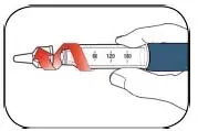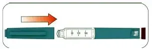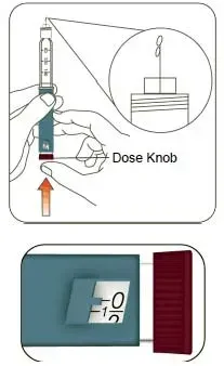- Continuez à tenir votre stylo avec de l'aiguille pointant vers le haut. Poussez le bouton de dose jusqu'à ce qu'il s'arrête et que 0 soit vu dans la fenêtre de dose. Tenez le bouton de dose et compter jusqu'à 5 lentement .