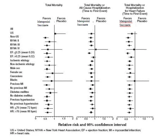 Le mérite-HF était une étude randomisée en double aveugle dans laquelle 3991 patients atteints de fraction d'éjection ≤ 0,40 et de l'insuffisance cardiaque NYHA de classe II-IV attribuable à l'hypertension d'ischémie ou à la cardiomyopathie ont été randomisés 1: 1 au métoprolol ou au placebo. Le protocole a exclu les patients présentant des contre-indications à des bêta-bloquants à utiliser ceux qui devraient subir une chirurgie cardiaque et ceux dans les 28 jours suivant l'infarctus du myocarde ou l'angine de poitrine instable. Les principaux critères d'évaluation de l'essai étaient (1) la mortalité toutes causes de causes plus l'hospitalisation toutes causes de causes (temps de premier événement) et (2) la mortalité toutes causes. Les patients ont été stabilisés sur un traitement concomitant optimal pour l'insuffisance cardiaque, y compris les inhibiteurs de diurétiques ACE, les glycosides cardiaques et les nitrates. À la randomisation, 41% des patients étaient de la classe II de NYHA; 55% NYHA CLASSE III; 65% des patients avaient une insuffisance cardiaque attribuée à une maladie cardiaque ischémique; 44% avaient des antécédents d'hypertension; 25% avaient un diabète sucré; 48% avaient des antécédents d'infarctus du myocarde. Parmi les patients de l'essai, 90% étaient sur les diurétiques, 89% étaient sur les inhibiteurs de l'ECA, 64% étaient sur des numériques 27% étaient sur un agent hypolipidéal, 37% étaient sur un anticoagulant oral et la fraction d'éjection moyenne était de 0,28. La durée moyenne du suivi était d'un an. À la fin de l'étude, la dose quotidienne moyenne de succinate de métoprolol était de 159 mg.
