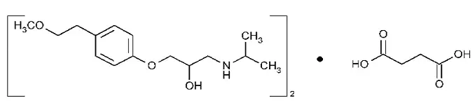 Le succinate de métoprolol est un agent de blocage adrénergène sélectif bêta1 (cardioslectif) pour l'administration orale disponible en tant que capsules à libération prolongée. Des capsules à libération étendue du succinate de métoprolol ont été formulées pour fournir une libération contrôlée et prévisible de métoprolol pour une administration une fois par jour. Les capsules à libération étendue comprennent un système à unité multiple contenant du succinate de métoprolol dans une multitude de pastilles à libération contrôlée. Chaque culot agit comme une unité de livraison de médicaments séparée et est conçu pour fournir du métoprolol en continu sur l'intervalle de dosage. Les capsules à libération prolongée contiennent 10,24 mg 20,48 mg 40,96 mg et 81,92 mg de base sans métoprolol présente à 23,75 mg 47,5 mg 95 mg et 190 mg de succinate de métoprolol et équivalent respectivement à 25 mg 50 mg 100 mg et 200 mg de métoprolol tartrate USP respectivement. Son nom chimique est (±) -1- (isopropylamino) -3- [p- (2-méthoxyéthyl) phénoxy] -2propanol succinate (2: 1) (sel). Sa formule structurelle est: