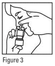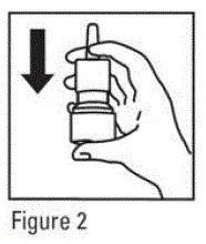 Pour chaque pulvérisation, maintenez le flacon pulvérisateur en position verticale et appuyez fermement vers le bas 1 fois sur les épaules de l'applicateur nasal blanc en utilisant votre index et vos doigts moyens tout en soutenant la base de la bouteille avec votre pouce. Respirez doucement vers l'intérieur à travers la narine (voir figure 4).