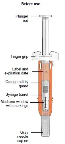 - Mettez immédiatement la seringue préreffilée utilisée dans un conteneur d'élimination des objets tranchants transportés par la FDA après utilisation. Ne pas throw away (dispose of) La seringue prérempli dans les ordures de votre ménage.
