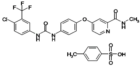 Le tosylate du sorafenib a le nom chimique 4- (4- {3- [4-chloro-3- (trifluorométhyl) phényl] ureido} phénoxy) n2méthylpyridine- 2-carboxamide 4-méthylbenzénesulfonate et sa formule structurelle est: p>