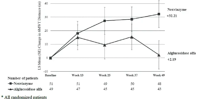 Le critère d'évaluation secondaire clé de l'étude 1 a été le changement de la distance totale parcouru en 6 minutes (test de marche de 6 minutes 6MWT) de la ligne de base à la semaine 49. À la semaine 49, le changement moyen LS par rapport à la ligne de base en 6MWT pour les patients traités par nexviazyme et alglucosidase alfa était respectivement de 32,2 mètres et 2,2 mètres respectivement. La différence de traitement estimée était de 30 mètres (IC à 95%: 1,3 58,7) favorisant le Nexviazyme (tableau 7). La figure 2 présente le changement moyen LS par rapport à la ligne de base dans la distance de 6 MWT au fil du temps par le groupe de traitement.