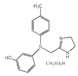 Le mésylate de phentolamine est phénol3 - [[(45-dihydro-1h-imidazol-2-yl) méthyl] (4-méthyl-phényl) amino] -méthanesulfonate (sel) un bloqueur adrénergique alpha non spécifique. Le mésylate de phentolamine USP est une poudre cristalline blanche à blanc cassé avec un poids moléculaire de 377,46.Il est épargné soluble dans l'eau soluble dans l'alcool et légèrement soluble dans le chloroforme. La formulation empirique est C 17 H 19 N 30 • ch 4 0 3 S et la structure chimique est: