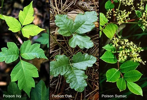 Mythe. Le lierre de poison est le seul à avoir toujours trois feuilles de chaque côté et un au centre. Ils sont brillants avec des bords lisses ou légèrement entaillés. Le chêne empoisonné est similaire mais les feuilles sont plus grandes et plus arrondies comme une feuille de chêne. Ils ont une surface poilue texturée. Il peut y avoir des groupes de trois ou sept feuilles. Les feuilles de sumac empoisonnées poussent en grappes de sept à 13 feuilles avec une seule à la fin.