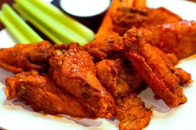 Prenez la viande noire la plus grielle d'un poulet - les jambes et les ailes - laissez la peau, donc il y a encore plus de graisse les draguez en farine blanche, faites-les frire dans l'huile et couvrez-les dans une sauce avec beaucoup de conservateurs chimiques et beaucoup de sel. Ensuite, trempez-les dans du fromage bleu ou de la sauce ranch avec plus de calories et de graisse. Le résultat: un grand prix nutritionnel.