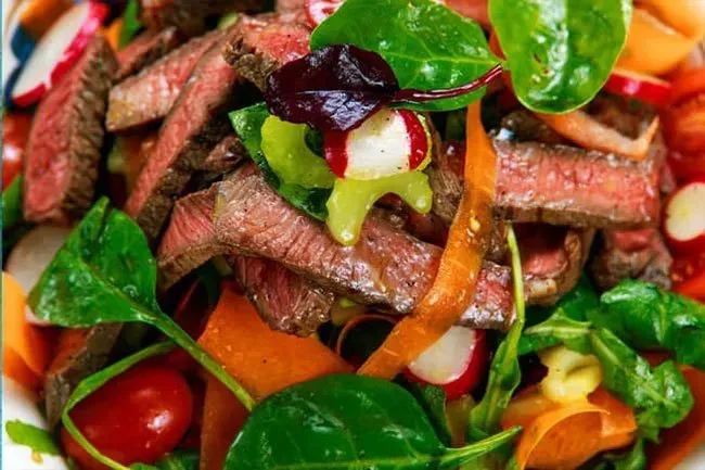 C'est un moyen de faire en sorte que votre solution de viande rouge tout en gardant au minimum les glucides simples et les calories. La seule grande variable est la vinaigrette qui peut ajouter beaucoup de matières grasses et de sucre si vous ne faites pas attention. Mais une salade avec des légumes et un filet maigre habillés légèrement avec un peu d'huile et de vinaigre ou de jus de citron vert font un repas sain et satisfaisant.