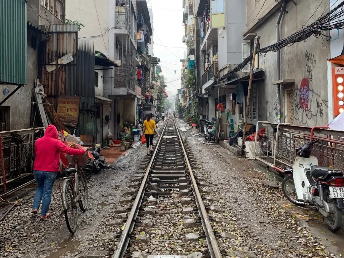 Ma tentative de prendre une jolie photo de la célèbre rue du train dans le vieux quartier de Hanoi.