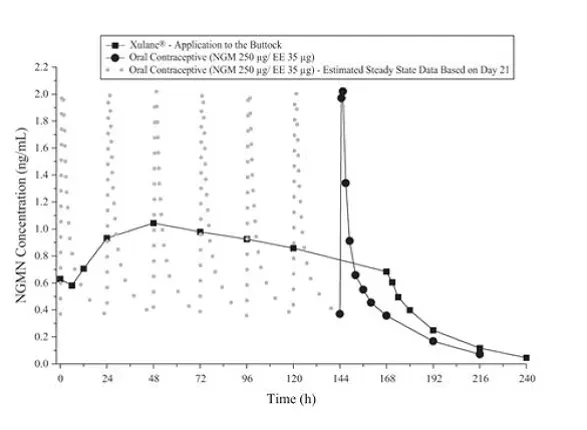Le xulane est un système transdermique avec une surface de contact de 14 cm². Il contient 4,86 mg de NoreLgestromin USP (NGMN) et 0,53 mg d'éthinyle estradiol USP (EE) et son taux de livraison est d'environ 150 mcg de NGMN et 35 mcg d'EE par jour. Les expositions systémiques (mesurées par la zone sous la courbe [AUC] et la concentration en régime permanent [CSS]) de NGMN et EE pendant l'utilisation de la norellegestromine et du système transdermique d'éthinyle estradiol sont plus élevées et le CMAX est inférieur à ceux produits par un contraceptif oral contenant NGM 250 MCG / EE 35 mcg. [Voir Avertissement en boîte et Pharmacologie clinique ]